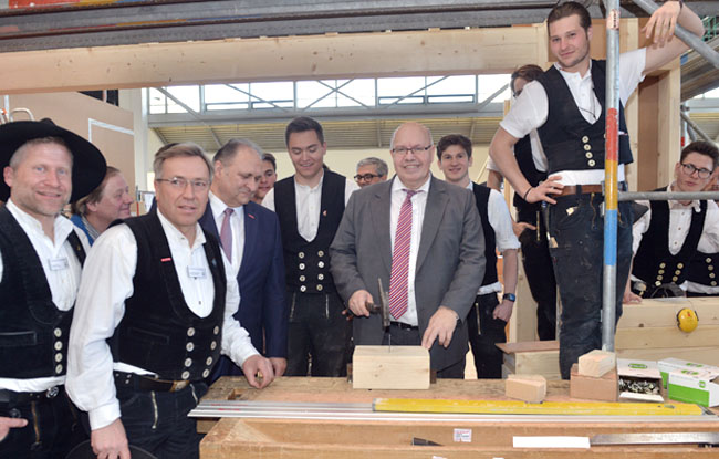 Bundeswirtschaftsminister Peter Altmaier hat auf seinem Rundgang über die Internationale Handwerksmesse IHM am 13. März 2019 in München die Zimmerer besucht. Am Stand übte er sich im Nageln und fachsimpelte mit den Vertretern der Zimmerer-Innung München. Auch Landtagspräsidentin Ilse Aigner kam zu Besuch und der Bayerische Rundfunk drehte ein Interview auf der Zimmerer-Live-Baustelle.